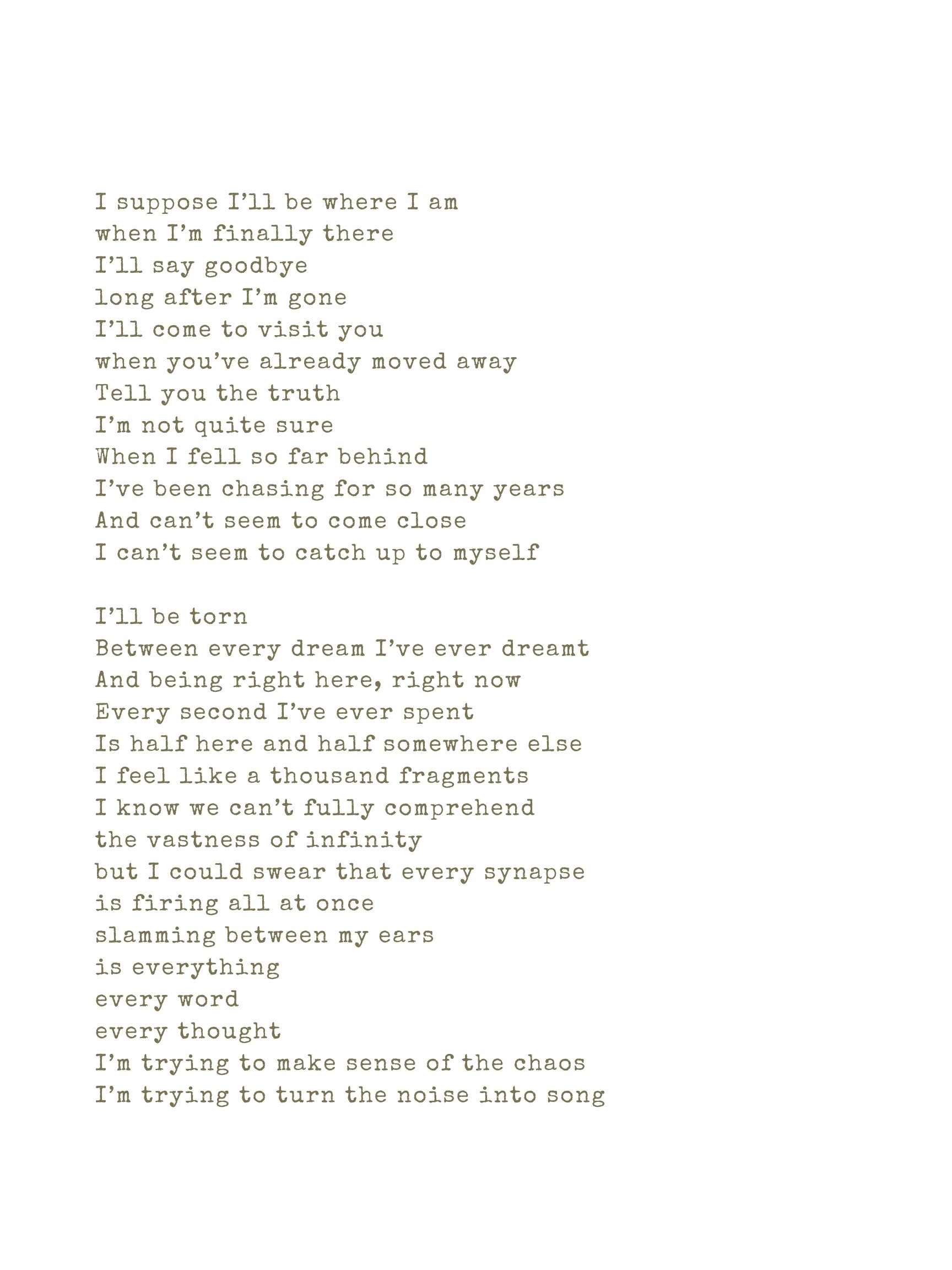 A typed poem or lyrics about feelings of longing, confusion, and trying to make sense of chaos, with themes of distance, dreams, and noise.
