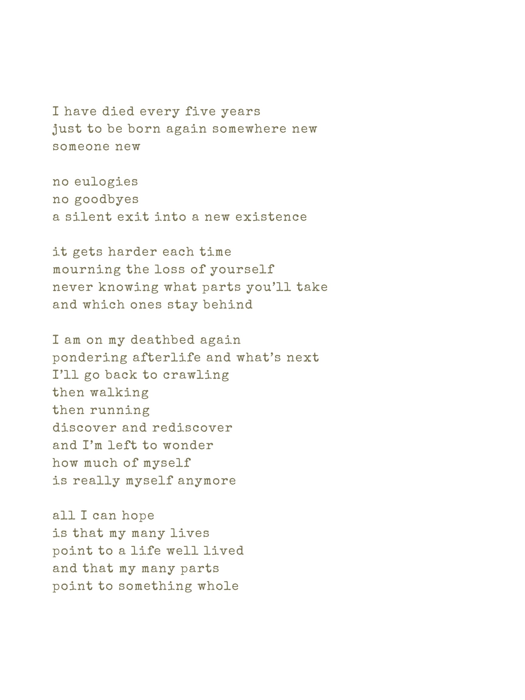 A poem written in typewriter font on a white background, reflecting on life, death, and self-discovery.